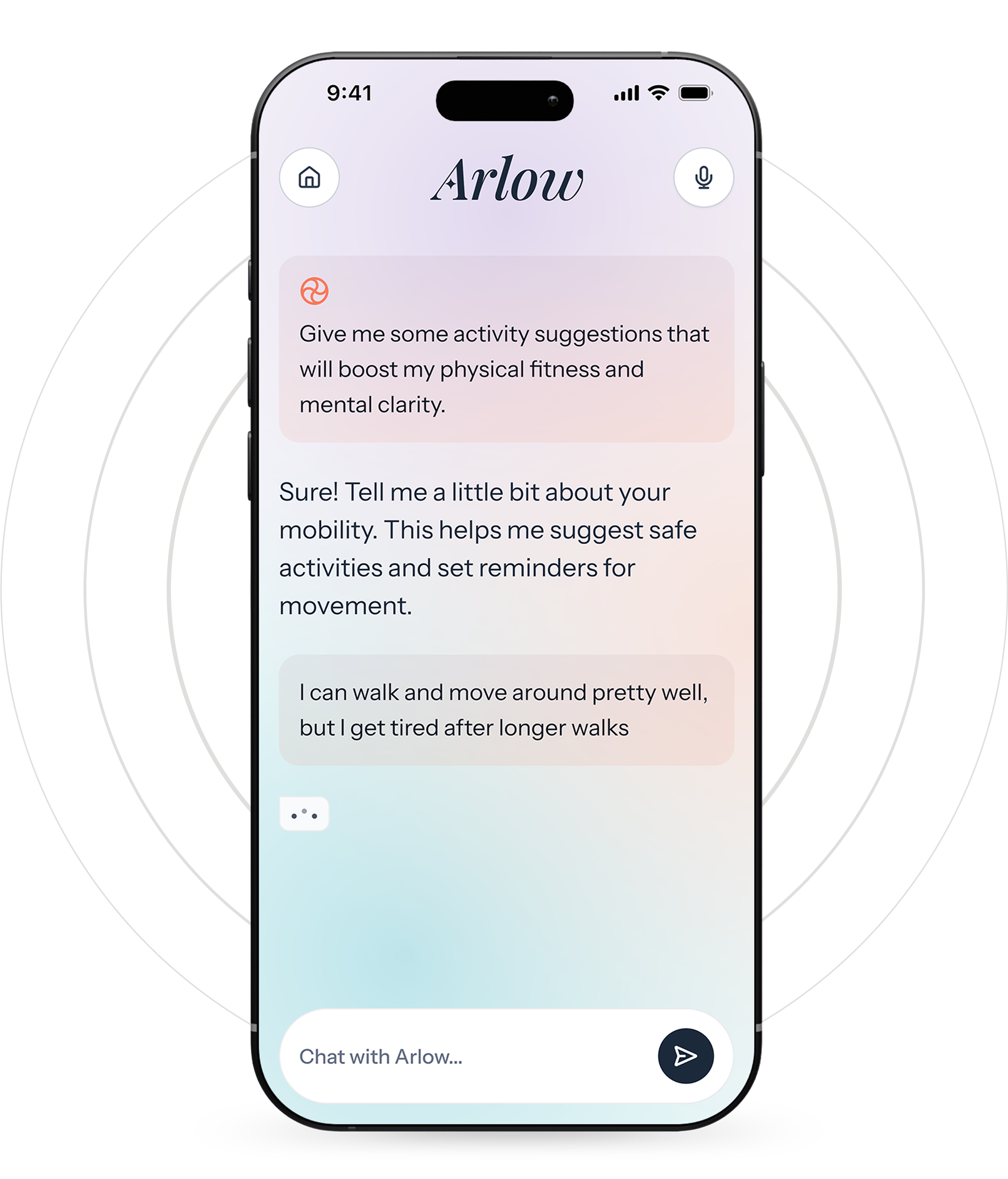Arlow is your everyday care companion, ready to answer questions, send reminders, and share thoughtful tips on everything from wellness to daily activities.